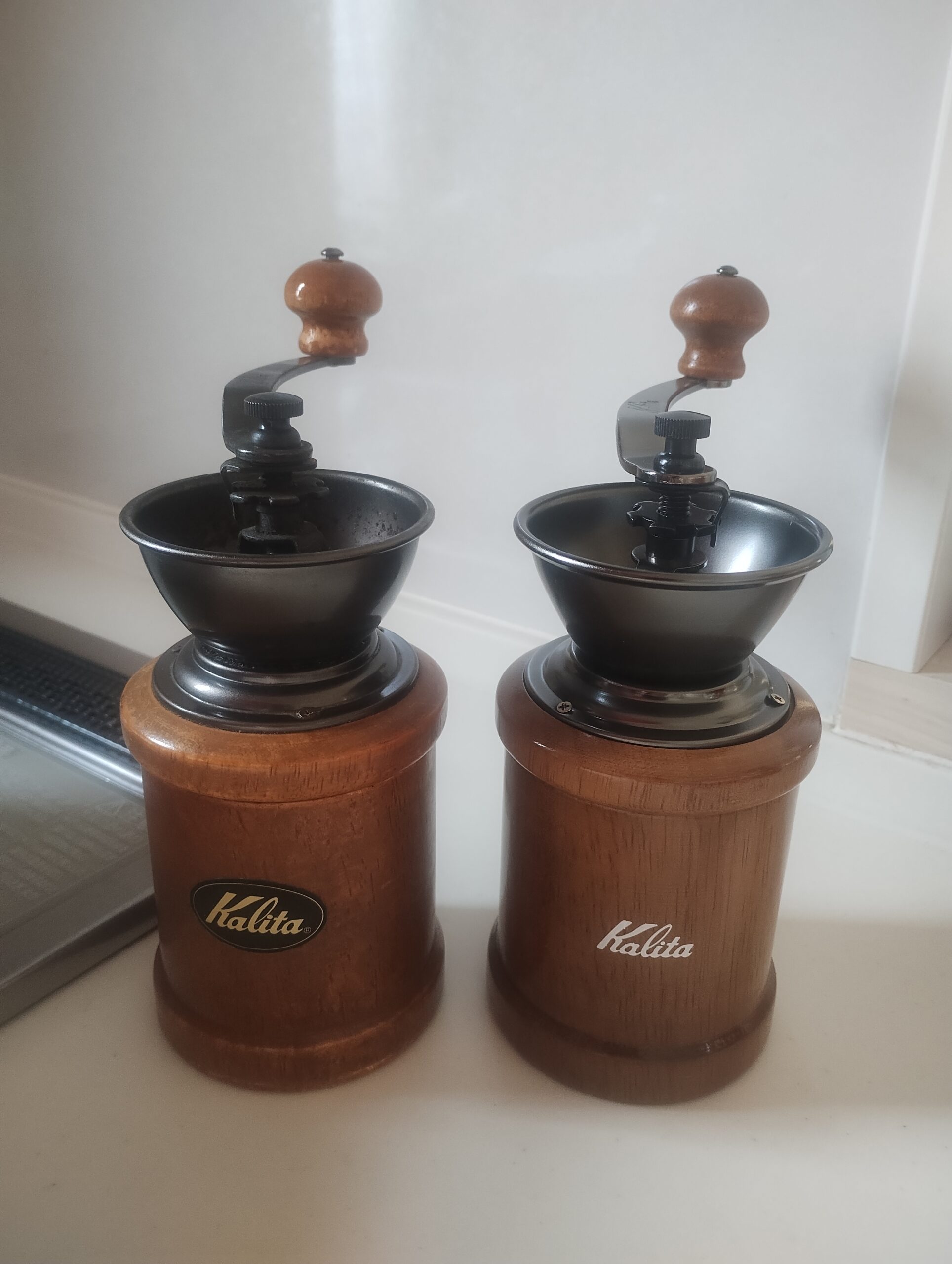 微妙に違う所が15年の歳月を物語る。新しいものの説明書きを見たら「体重をかけるほどの力で挽かないで下さい」とありましたが、子どもの力ではなかなかうまくいかず、コーヒーミルを両足裏ではさんで両手で豆を挽いてくれた時代もありました。